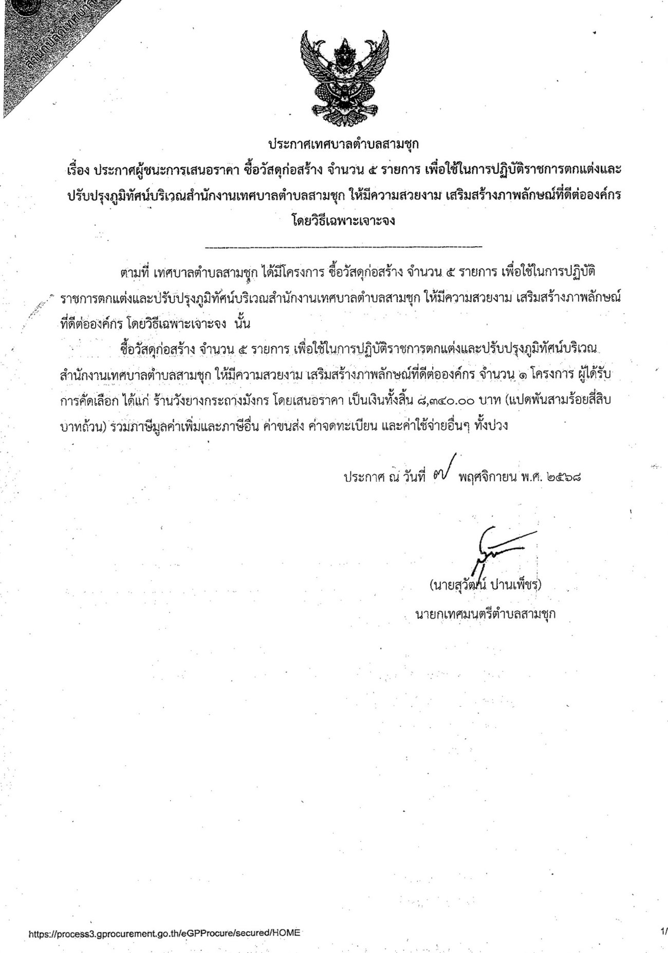 ประกาศผู้ชนะการเสนอราคา ซื้อวัสดุก่อสร้าง จำนวน 5 รายการ เพื่อใช้ในการปฏิบัติราชการตกแต่งและปรับปรุงภูมิทัศน์บริเวณสำนักงานเทศบาลตำบลสามชุก ให้มีความสวยงาม เสริมสร้างภาพลักษณ์ที่ดีต่อองค์กร โดยวิธีเฉพาะเจาะจง