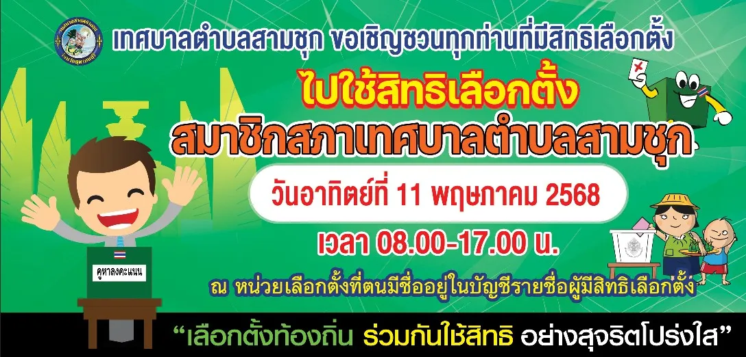 11 พ.ค.68 ขอเชิญชวนผู้มีสิทธิเลือกตั้ง ไปใช้สิทธิเลือกตั้งสมาชิกสภาเทศบาลตำบลสามชุก