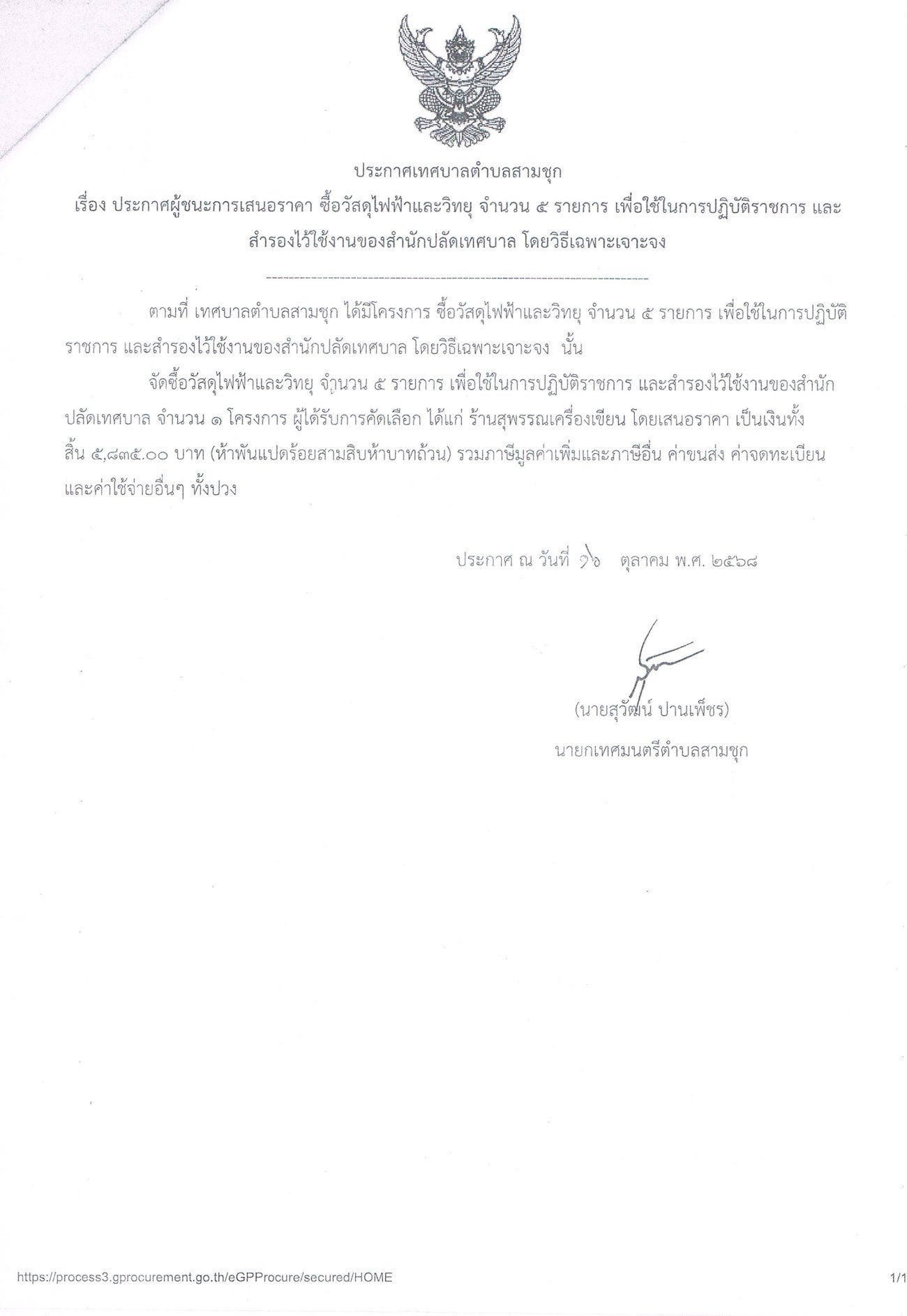 ภาพที่เกี่ยวข้อง ประกาศผู้ชนะการเสนอราคา ซื้อวัสดุไฟฟ้าและวิทยุ จำนวน 5 รายการ เพื่อใช้ในการปฏิบัติราชการและสำรองไว้ใช้งานของสำนักปลัดเทศบาล โดยวิธีเฉพาะเจาะจง