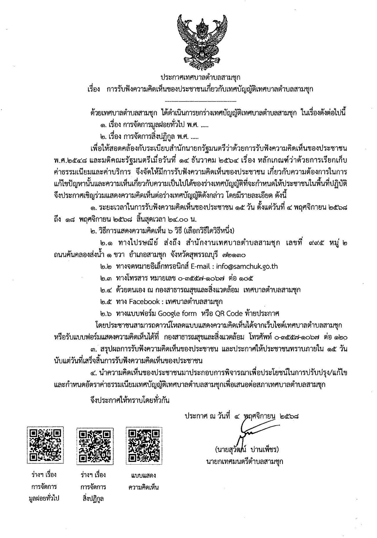 ประกาศเทศบาลตำบลสามชุก เรื่อง การรับฟังความคิดเห็นของประชาชนเกี่ยวกับเทศบัญญัติเทศบาลตำบลสามชุก