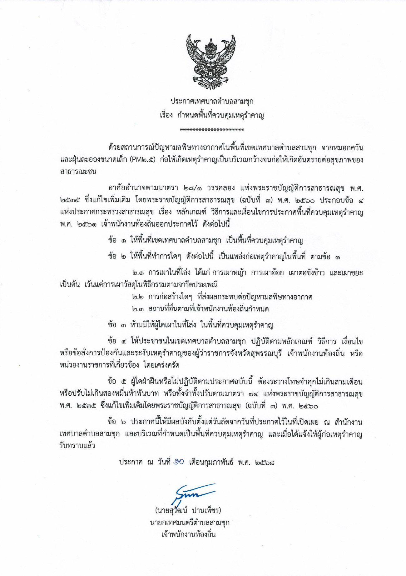 ประกาศเทศบาลตำบลสามชุก เรื่อง กำหนดพื้นที่ควบคุมเหตุรำคาญ ขอความร่วมมือพี่น้องประชาชน งดการเผาในที่โล่งทุกประเภท อาทิ การเผาขยะ , การเผาเศษวัสดุทางการเกษตร , การเผาป่า หญ้า หรือพื้นที่โล่ง หากฝ่าฝืน มีโทษตามกฎหมาย